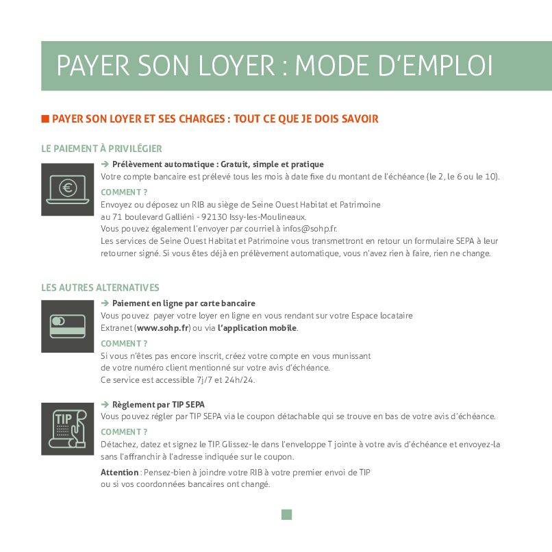 Vous pouvez régler par chèque à l’ordre de Seine Ouest Habitat et Patrimoine.